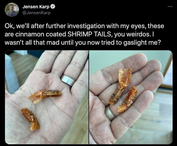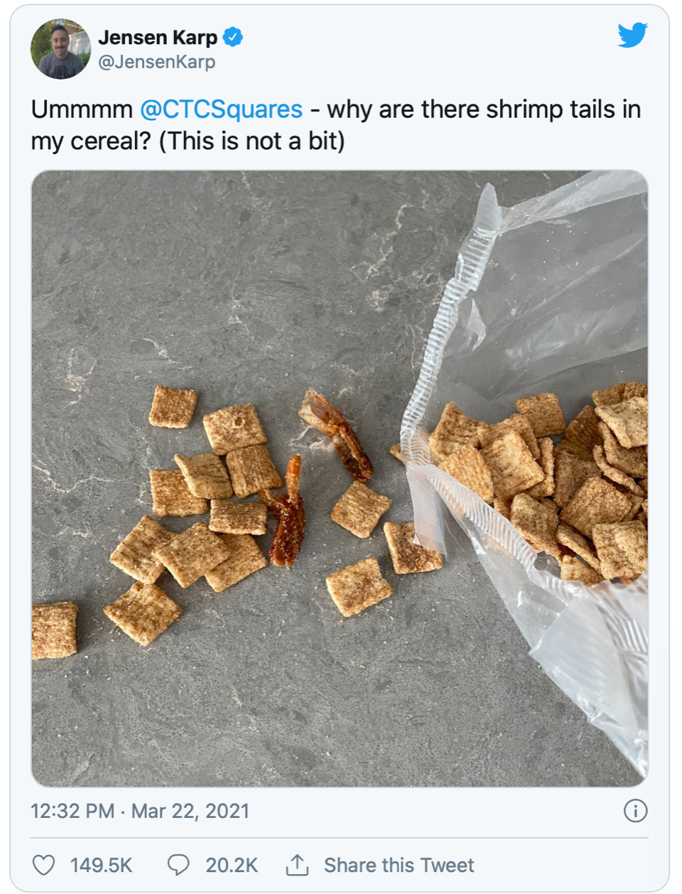 I’m sure by now you have heard about the Cinnamon Toast Crunch shrimp fiasco. If not, let me break it down for you. Basically, a guy finds two shrimp tails in his Cinnamon Toast Crunch box, along with some other items, like floss and weird black substances (let’s hope for his sake it wasn’t rat poop…). He tweets about it. It blows up. The internet goes crazy.